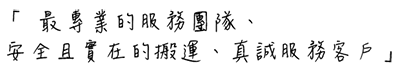 另外,我們對於搬家師傅的素質要求也特別嚴格。除了對於搬運及家具拆裝的基本專業能力的要求外,師傅的形象及態度也是我們嚴格要求的地方, 我們絕不容許讓客戶有遇到像流氓搬家的不良感受及體驗。為此,我們在篩選工作人員上,秉持著寧缺勿濫的精神做嚴格的把關,以確保讓每個客戶 都能得到愉快且滿意的搬遷體驗。