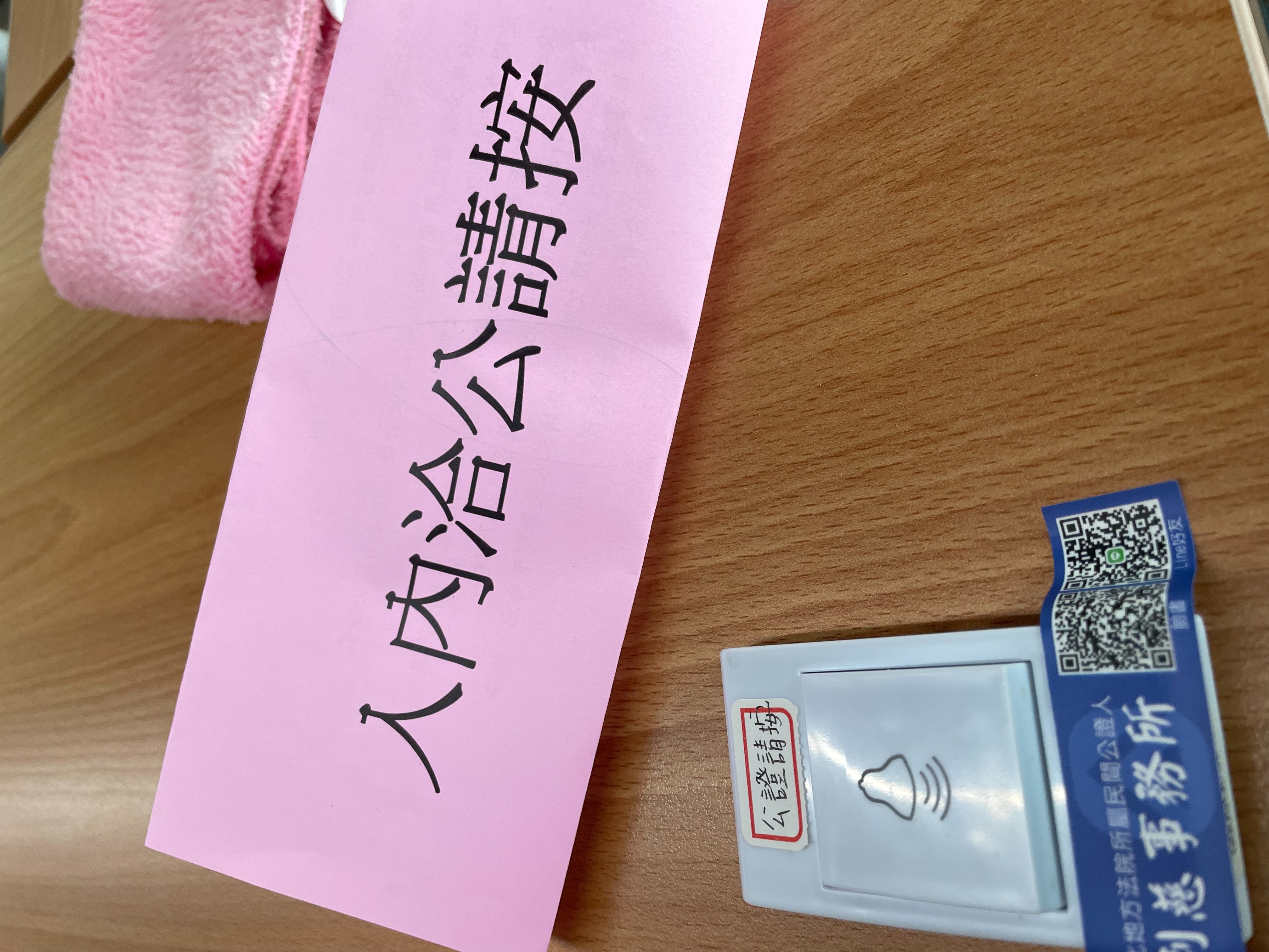 請洽公民眾在門口按鈴,等待公證人出來幫您辦理文件,過程中或許有點不便,但請見諒