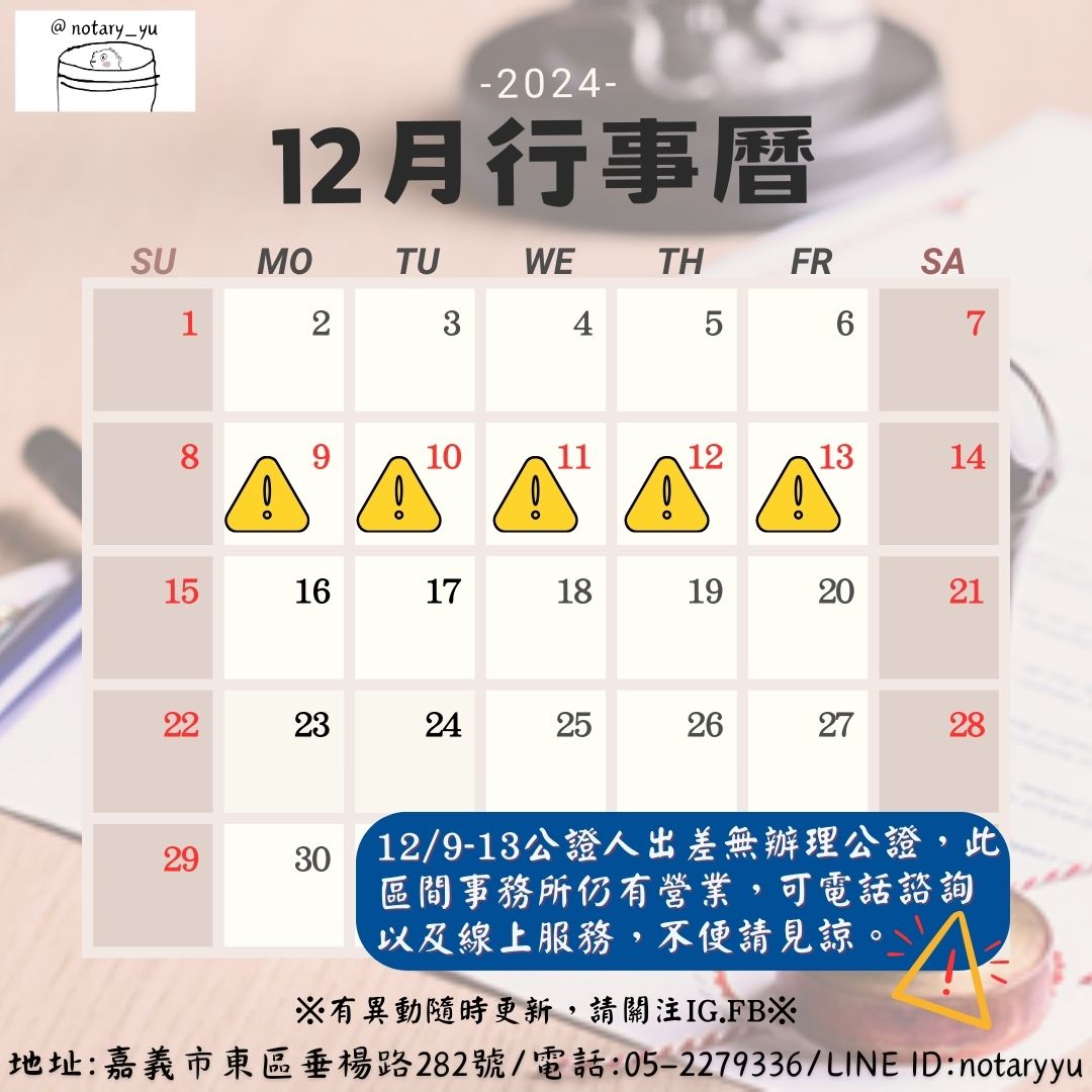 12/9-12/13公證人出差,此區間無辦理公證。