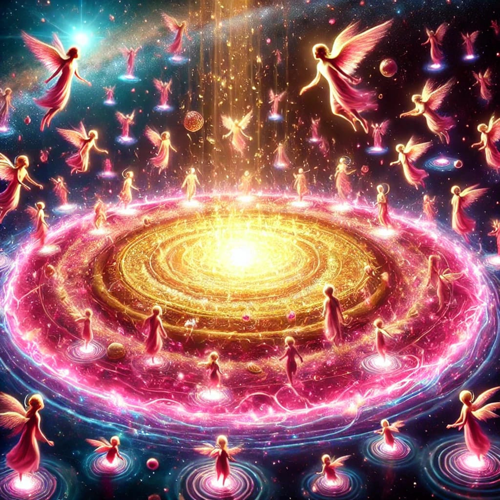 那個小天使與那個抱著的「繭」,一直往前走,有許多小天使在排隊,抱著「繭」的那個小天使,走到很前面,在小天使的前方,有一個粉紅色,又透著金色的發光水池,我看到很多小天使,主動跳進水池,我看到的那個小天使,將手中抱著的「繭」,丟進水池中,然後,在水池邊觀察。