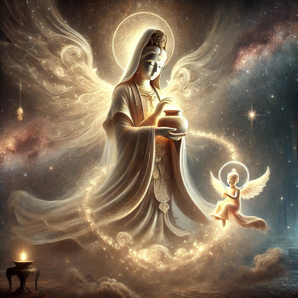 琪琪:我看到「觀世音菩薩」的水瓶中,流出一個「小天使」,手中抱著一個「繭」。