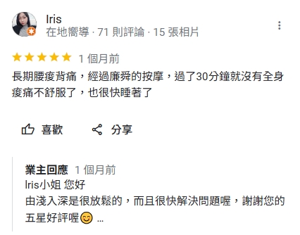 長期腰痠背痛,經過廉舜的按摩,過了30分鐘就沒有全身痠痛不舒服了,也很快睡著了