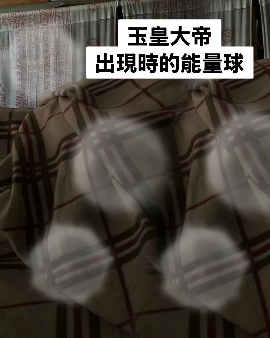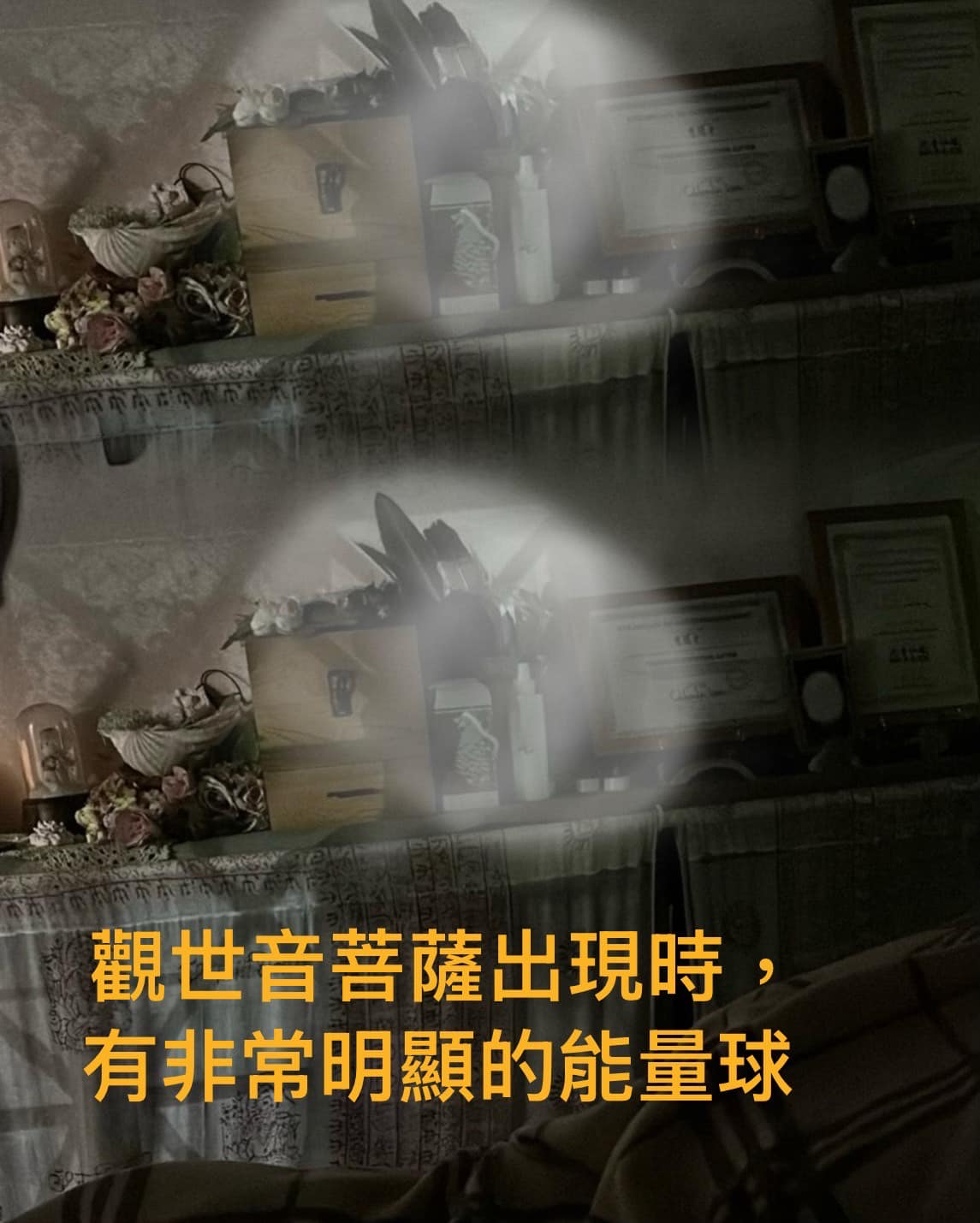 當玉皇大帝與觀世音菩薩出現時,發生了奇妙的事情,旁邊監控的手機,竟然拍到清楚且明亮的能量球。
