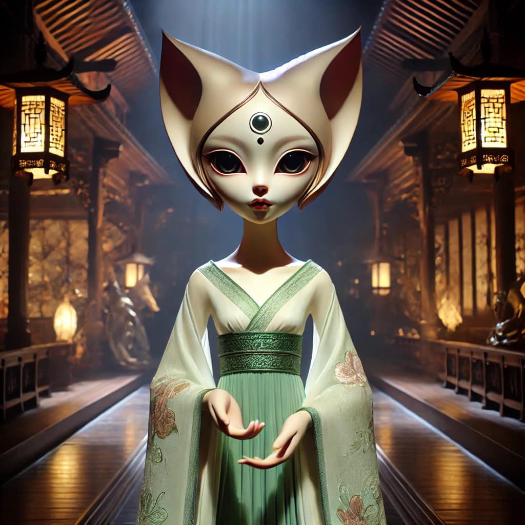 進入元辰宮的客廳,剛才院子裡的「管家」,臉部變形成「招財貓」,比較圓潤,頭頂上有一對大耳朵,眼睛細長,穿綠色的衣服。