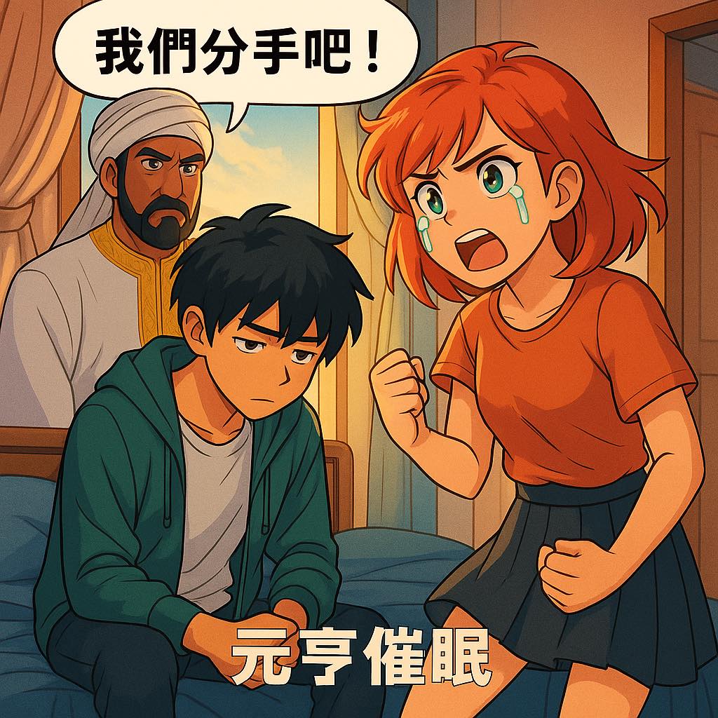 在催眠師引導下,那位熟悉的元辰宮守護神「阿拉伯管家」,陪同男朋友出現在臥室裡,坐在雙人床上。