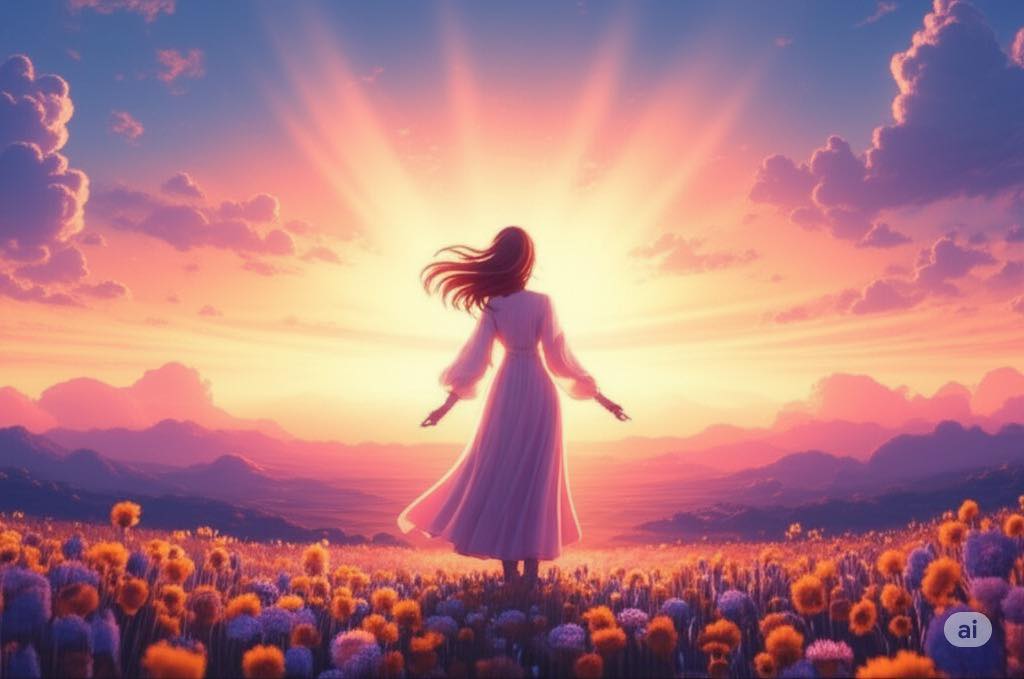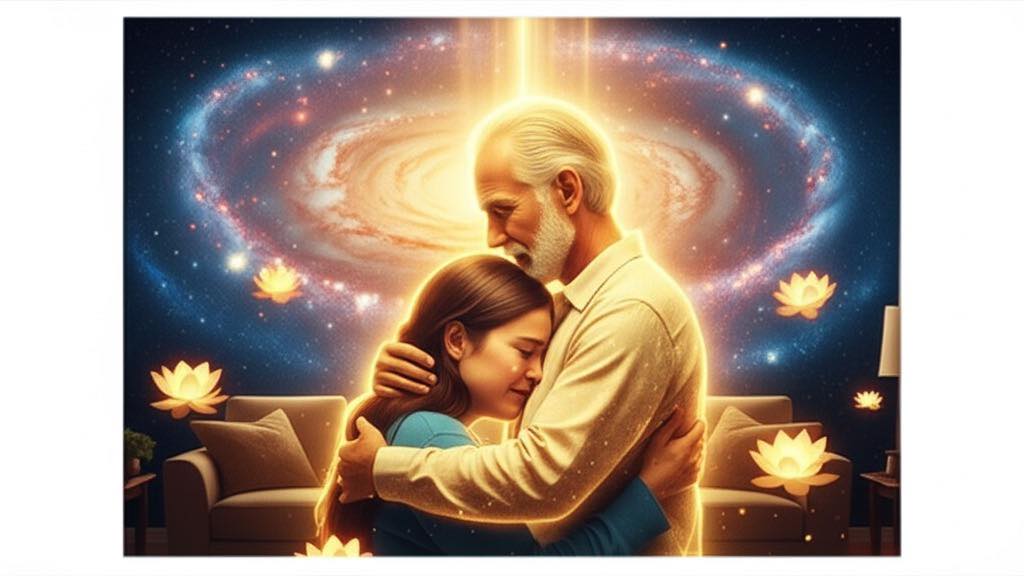 在擁抱後,她看見父親的影像,在光中微笑消散,彷彿安心了,也放手了。