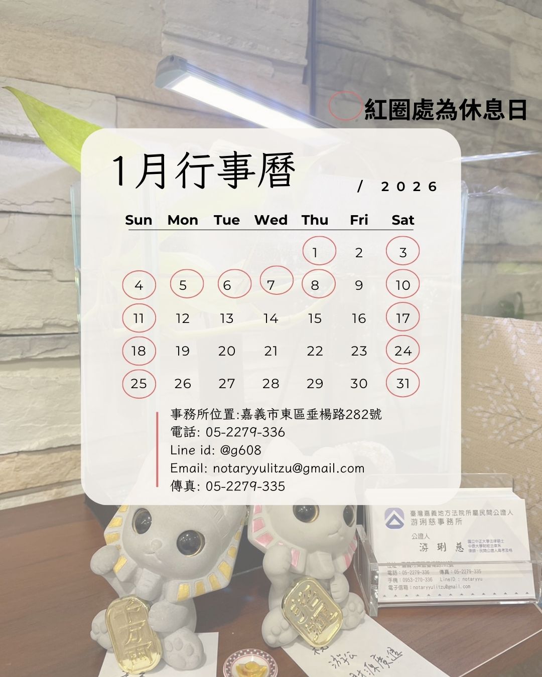 115年1月行事曆 |公證人游琍慈事務所-#公證人#房屋租賃公證 #嘉義太陽能屋頂公證 #嘉義太陽能土地公證#離婚協議書公證