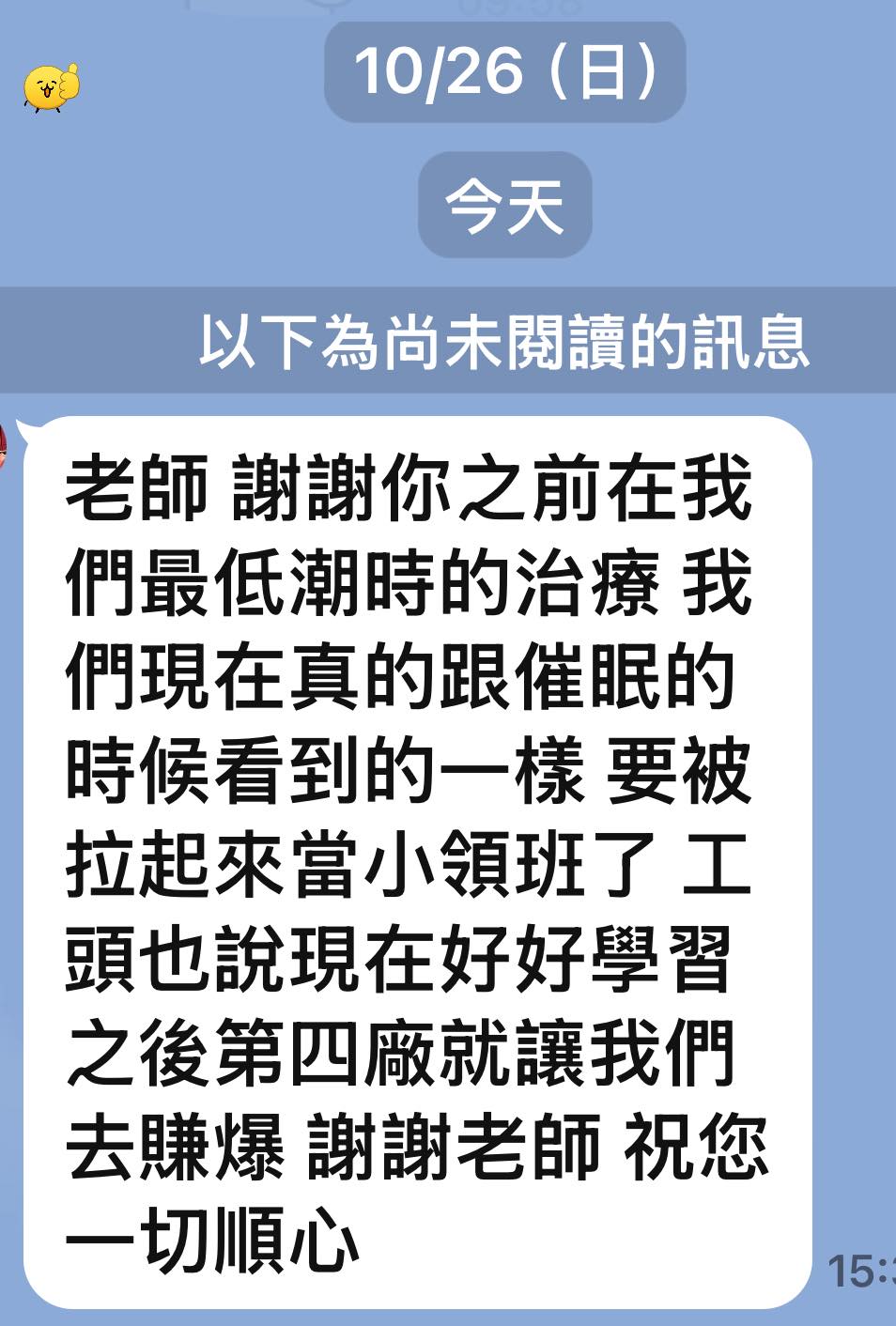 「老師,謝謝你之前,在我們最低潮時的治療我」