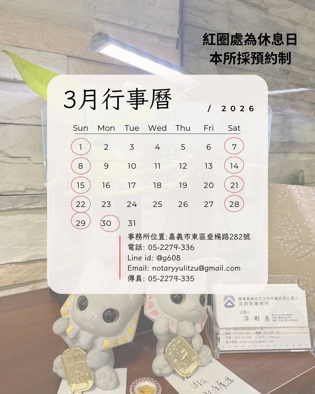 115年3月行事曆 |公證人游琍慈事務所-#公證人#房屋租賃公證 #嘉義太陽能屋頂公證 #嘉義太陽能土地公證#離婚協議書公證
