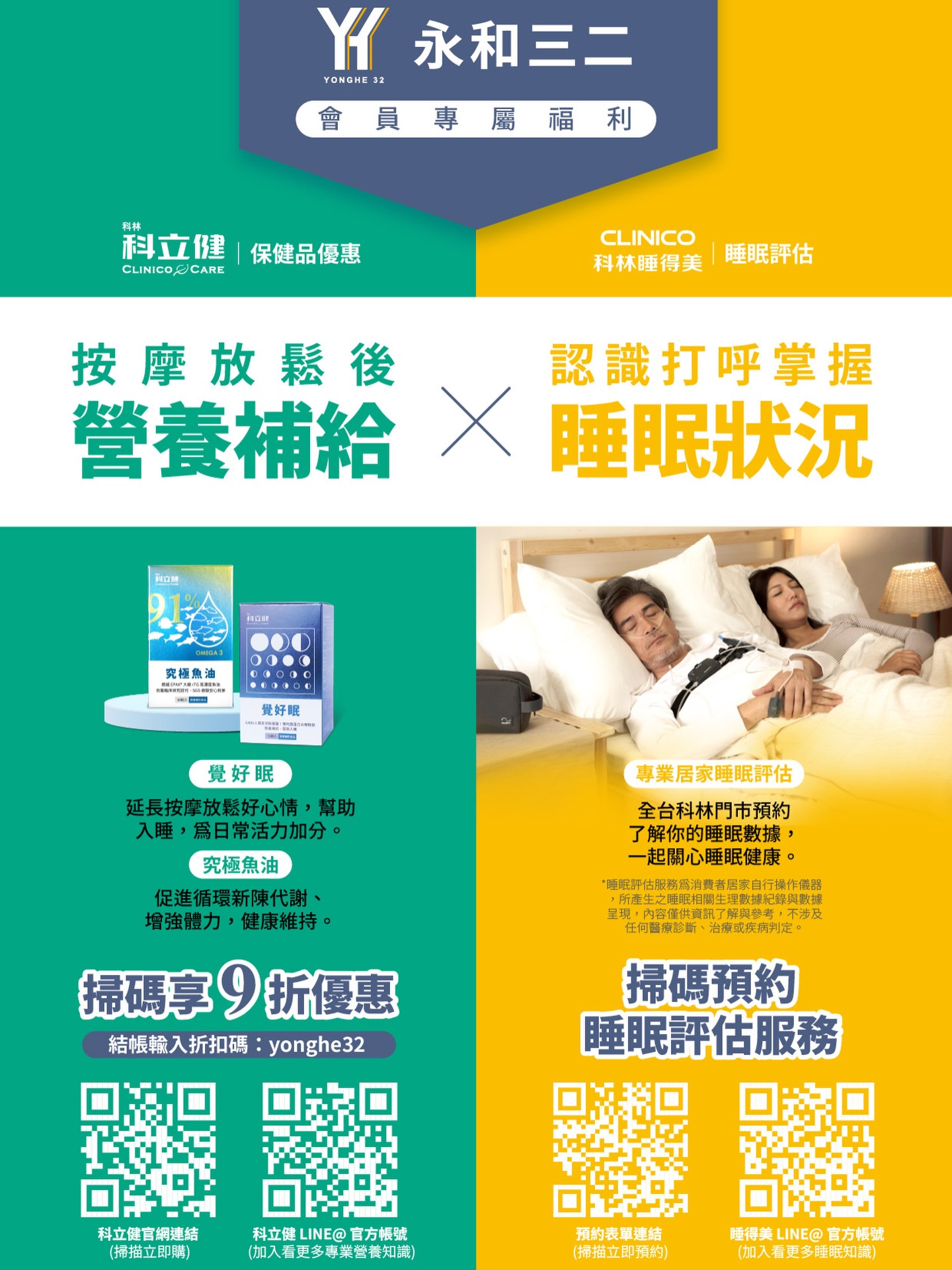 讓科立健、睡得美一起為您的日常生活添一點溫柔的照顧。 按摩後放鬆的身體,正是營養補給的黃金期: 科立健究極魚油:促進新陳代謝 健康維持。