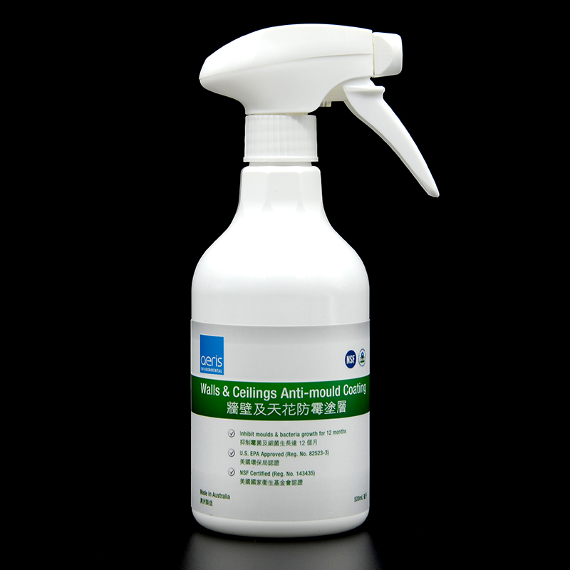 建議利用 SmellGREEN®天然抗菌清潔液 預先清潔牆壁及天花以清除塵埃及碎屑,然後直接將 SafePRO® AerisGuard 牆壁及天花防霉塗層 噴灑於表面上(噴灑時建議距離牆身大約 20cm),待風乾。